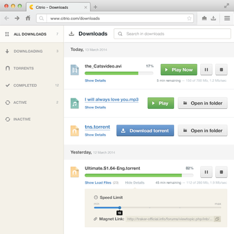 With Citrio Download Manager you can download files several times faster than with common browsers, pause downloads and resume them whenever you want. Citrio has a built-in torrent client which allows to download torrent files and magnet links right inside the browser with no need to download any additional software.