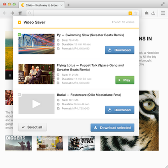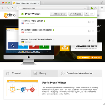 Citrio has a powerful Media Grabber tool with which you can download videos from 50+ most popular websites in a snap. You just have to open a page with a video and click a download button. The Social Share extension makes the process of sharing on Twitter, Facebook and Google+ much easier and faster. Citrio Proxy Widget allows to browse the Web via proxy servers easily. You can change your virtual location in a snap not leaving the browser.